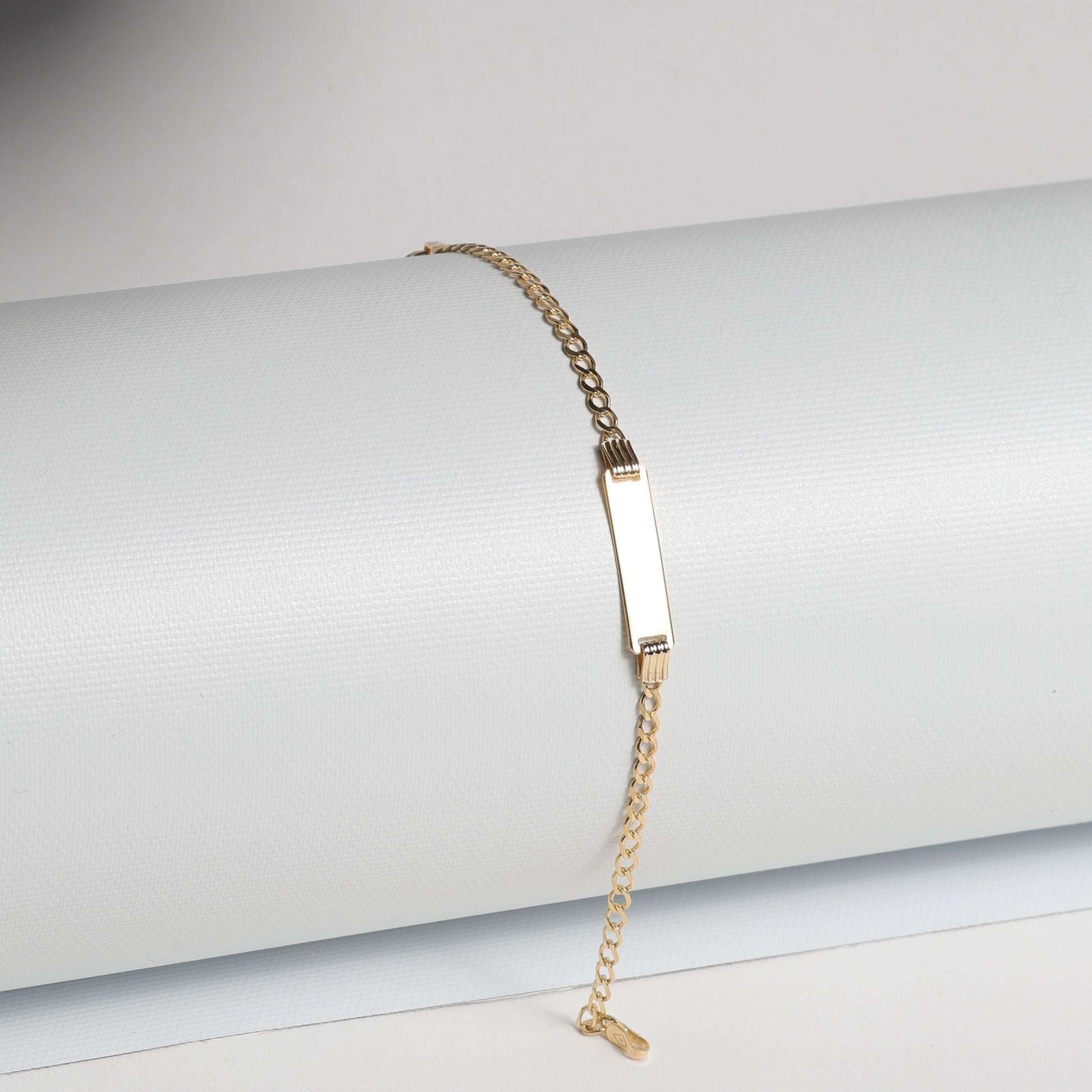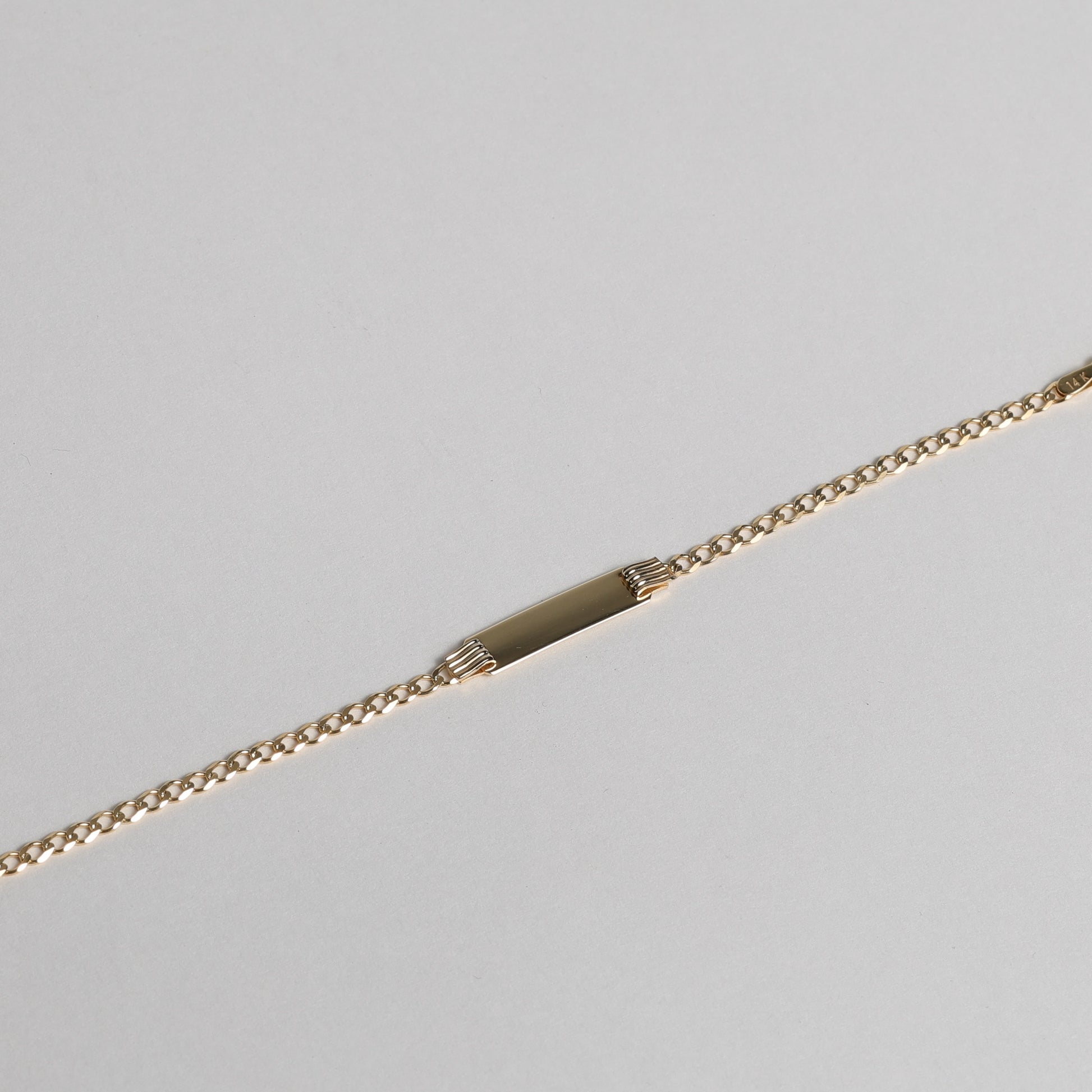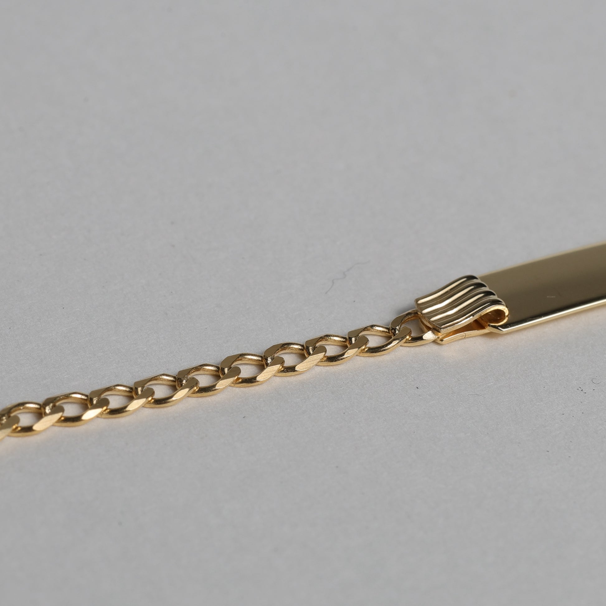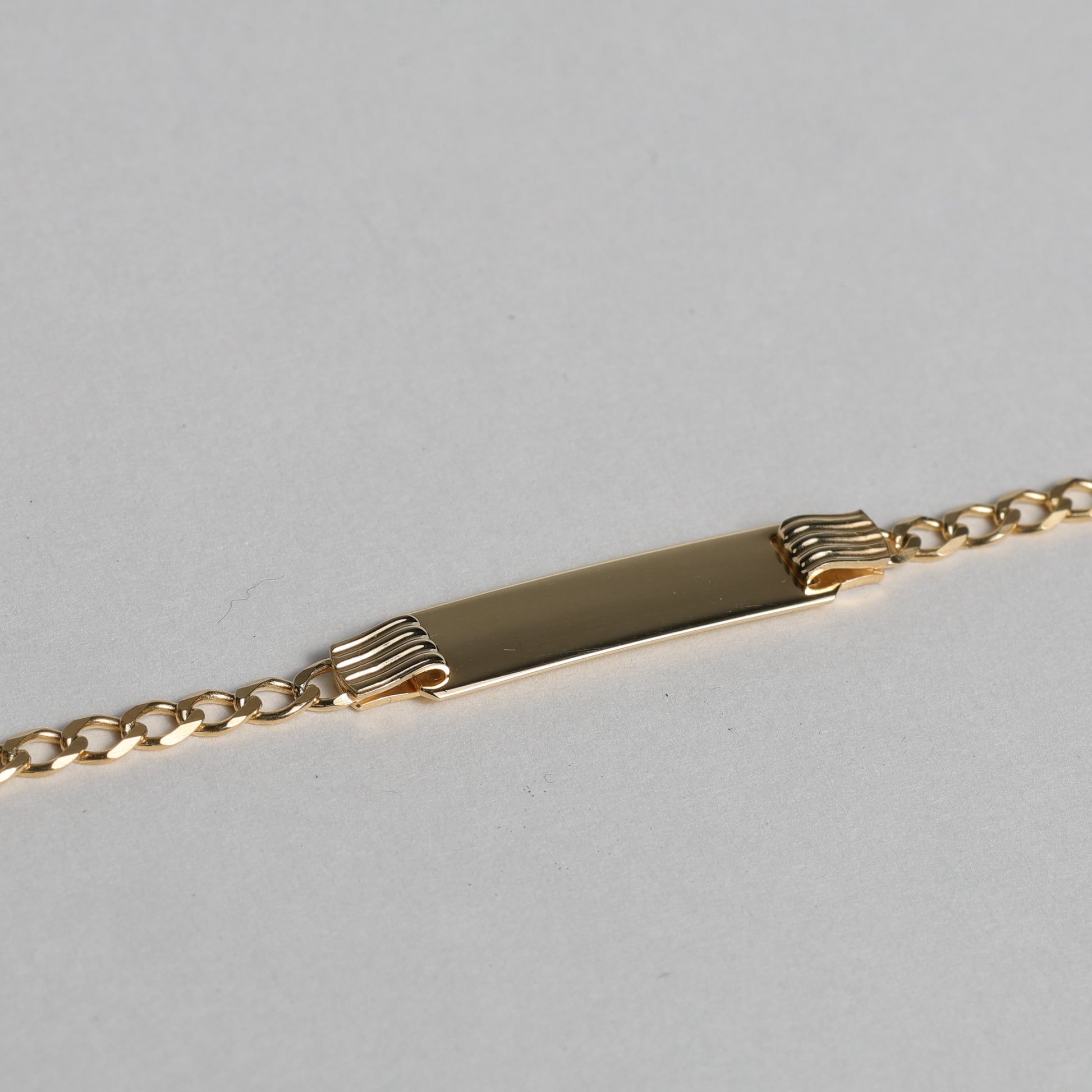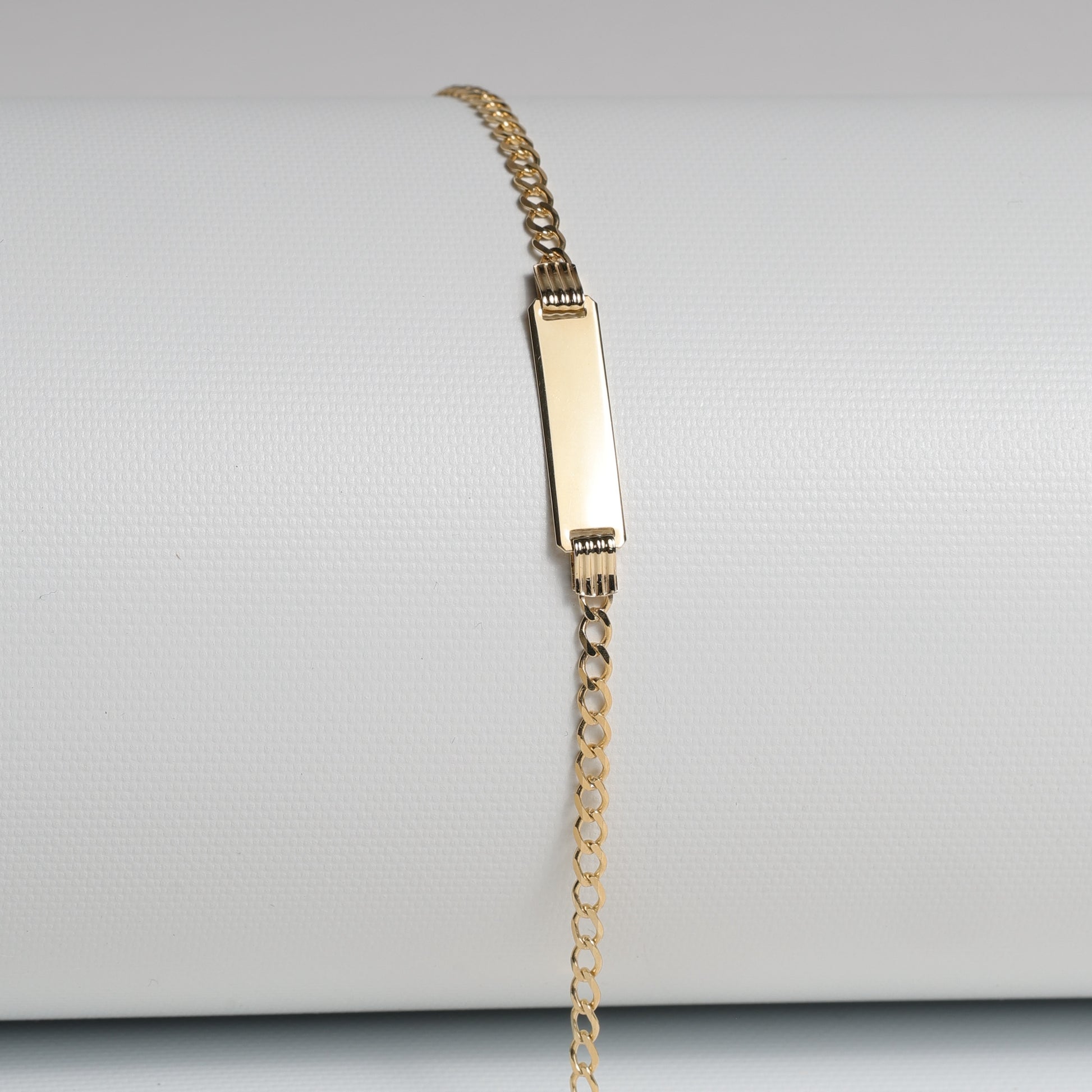 Timeless and elegant, this 14K yellow gold ID bracelet is a true classic. Featuring a sleek, polished nameplate perfect for engraving names, dates, or meaningful messages. The refined Figaro-style chain adds a touch of sophistication, making it ideal for everyday wear or as a thoughtful gift.