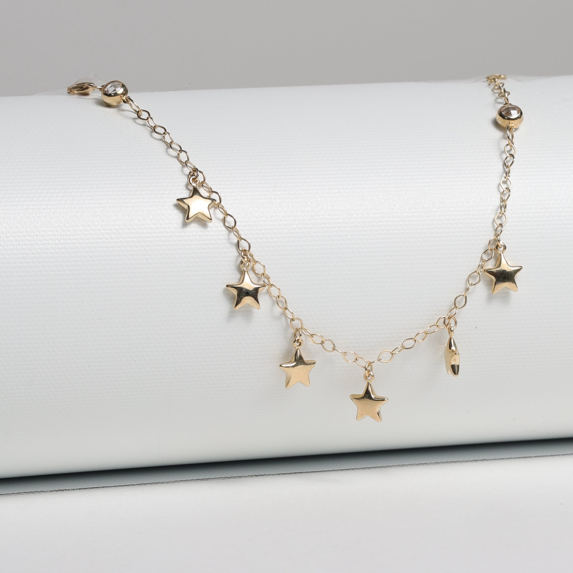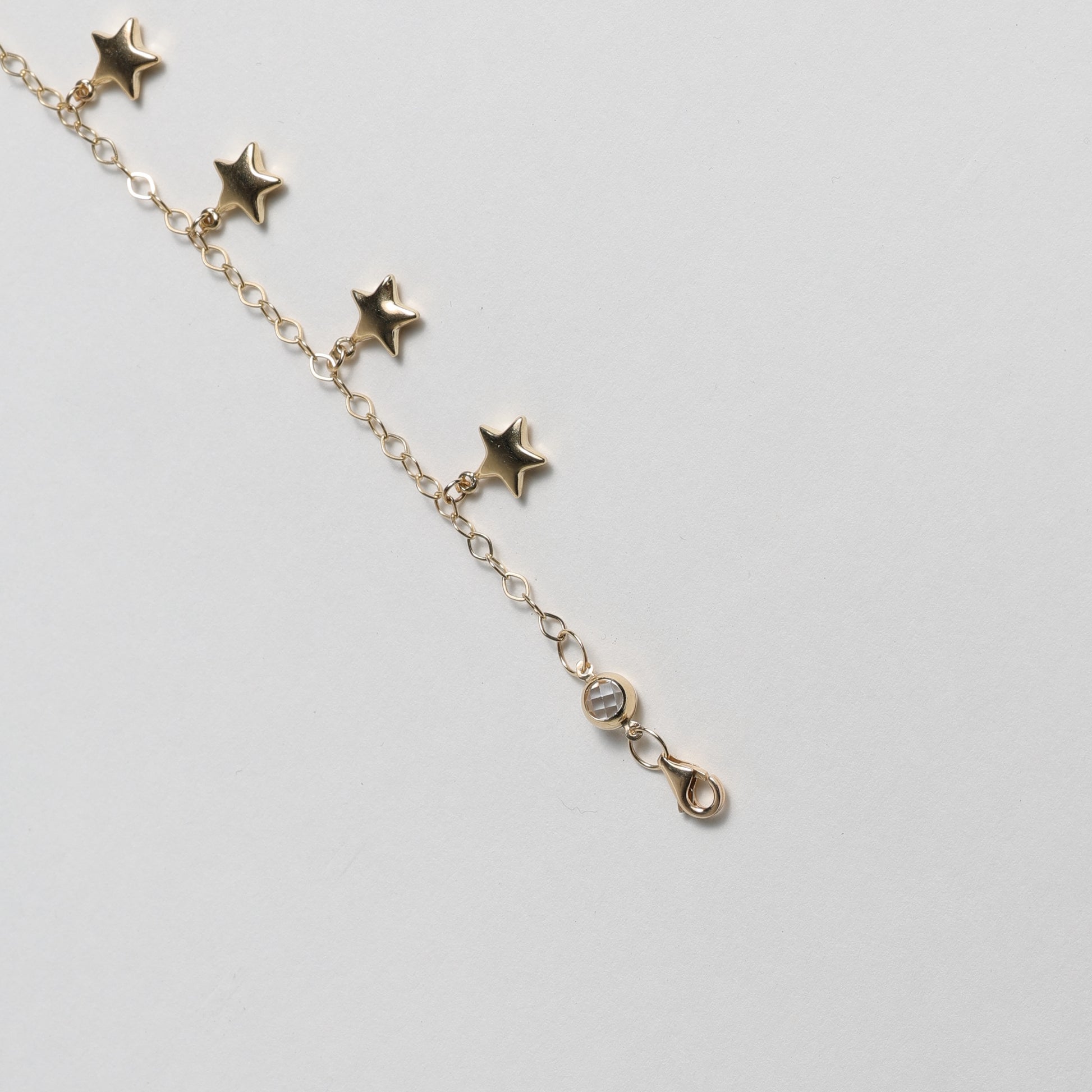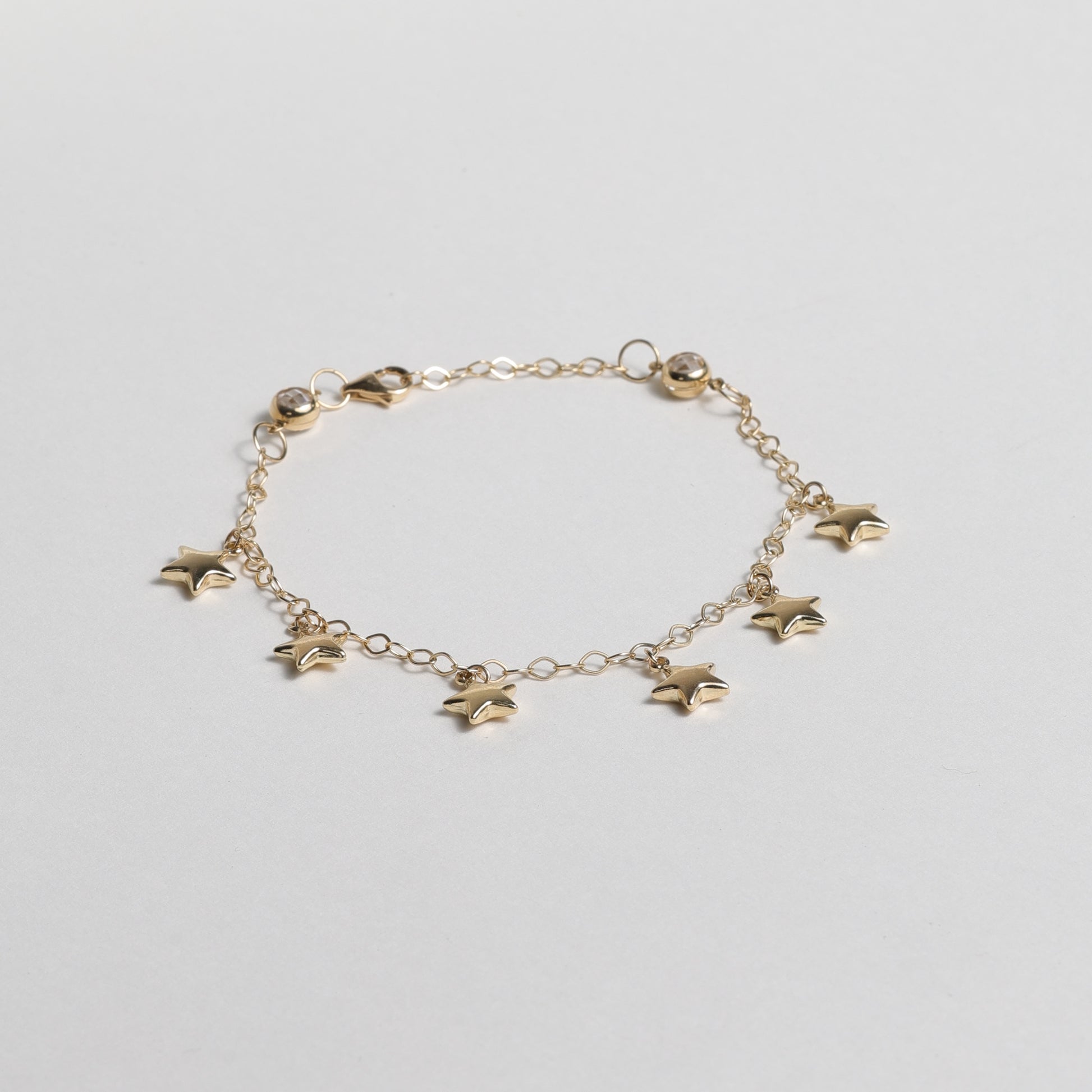Delicate and full of charm, the Starlight Dreams bracelet is crafted in solid 14K yellow gold and features a series of dainty star charms that shimmer with every movement. The fine link chain adds a touch of elegance, while two bezel-set crystals at the ends give it a playful sparkle. Perfect for everyday wear or as a gift to celebrate a new beginning.
